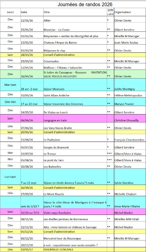 Cotation de la difficulté de la randonnée : * = facile - ** = Bons marcheurs - *** = difficile - Dénivelées : Pb = Point bas - Ph = Point haut.1er trimestre 20262ème trimestre 2026année 2026Récapitulatif années précédentesInvitations de janvier à mars 2026dimanche 11 janvier Altier *- Olivier Devès